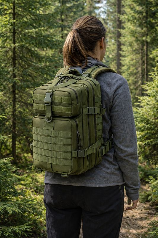 De rugtas beschikt over meerdere ruime compartimenten met sterke ritsen, waardoor je uitrusting overzichtelijk en veilig opgeborgen blijft. Het MOLLE-systeem aan de voor- en zijkanten maakt het mogelijk om extra pouches of accessoires te bevestigen, zodat je de tas volledig kunt aanpassen aan je behoeften.
