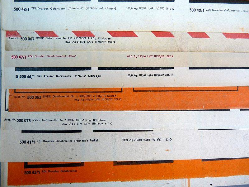 8x DDR gevaarsetiketten vellen – vintage ZDL Dresden