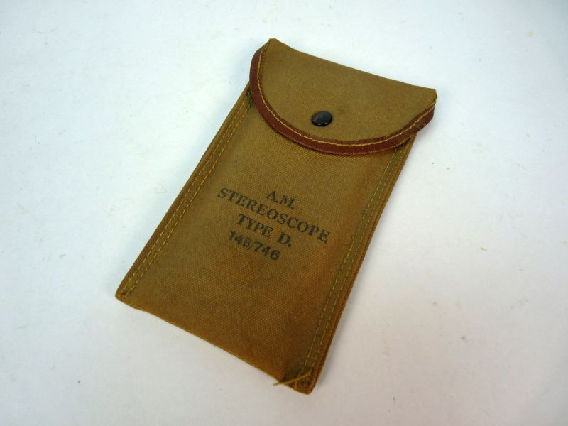 De originele stevige canvas opberghoes met drukknopsluiting en opschrift “A.M. Stereoscope Type D 149746”
