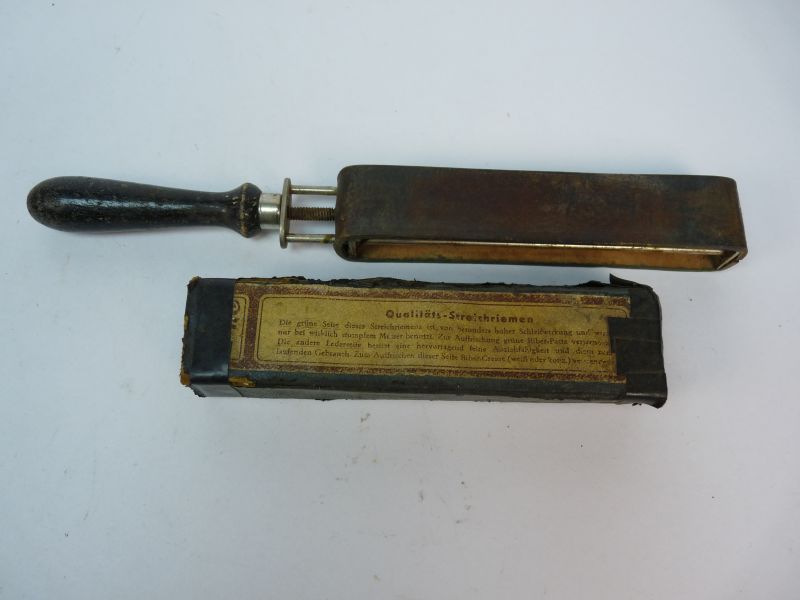 De set bestaat uit een metalen houder met houten handgreep en een verwisselbare leren stropping band. Op de band bevindt zich nog het originele etiket met Duitse tekst: “Qualitäts-Streichriemen”. Dit geeft aan dat het om een kwaliteitsproduct gaat.