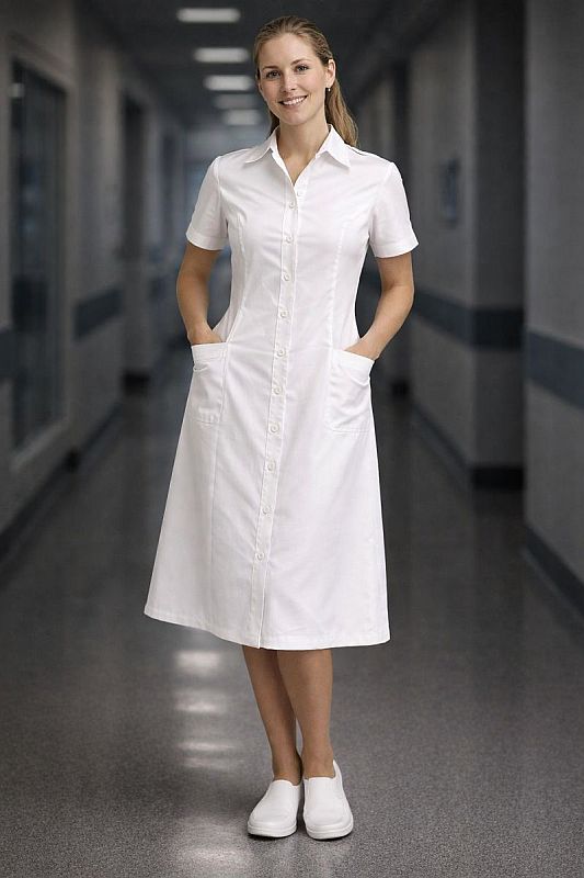 De lengte valt onder de knie, wat zorgt voor een verzorgde en professionele uitstraling. Geschikt voor gebruik in klinische, medische en zorgomgevingen, maar ook geliefd als vintage of uniformjurk.