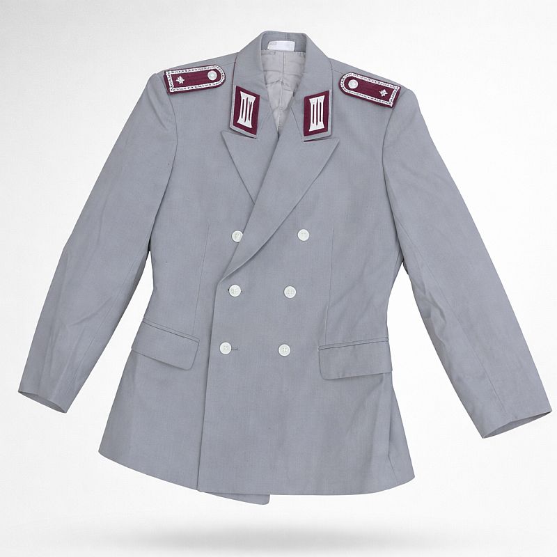 De afwerking is zorgvuldig en symmetrisch, wat typerend is voor uniformen uit deze periode. De combinatie van grijs, bordeaux en zilver zorgt voor een sobere maar toch elegante uitstraling, passend bij een ceremoniële of representatieve functie binnen de DDR-brandweer.