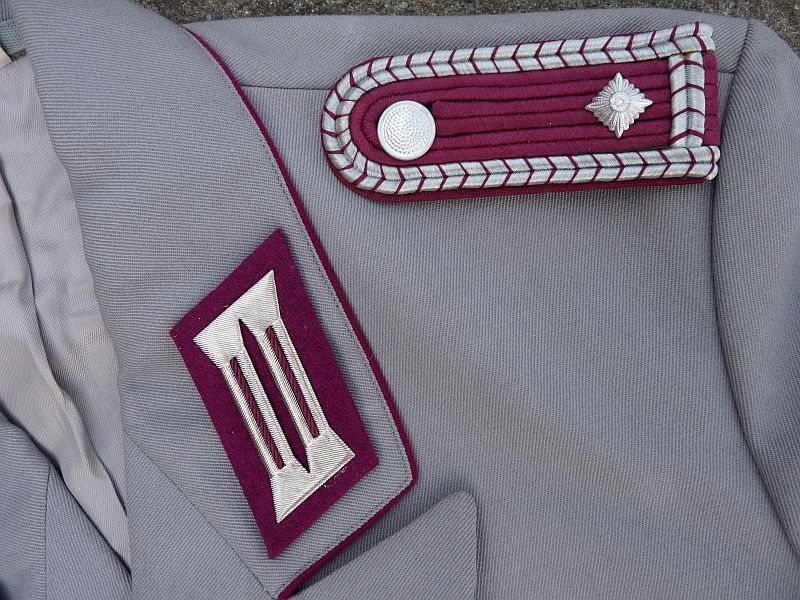De afwerking is zorgvuldig en symmetrisch, wat typerend is voor uniformen uit deze periode. De combinatie van grijs, bordeaux en zilver zorgt voor een sobere maar toch elegante uitstraling, passend bij een ceremoniële of representatieve functie binnen de DDR-brandweer.