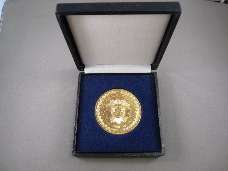 Vorm & materiaal: De medaille is rond en goudkleurig, met een prominente stervormige straling in reliëf. Het middelpunt toont het nationale embleem van de DDR: een hamer en passer omringd door een krans van korenaren.