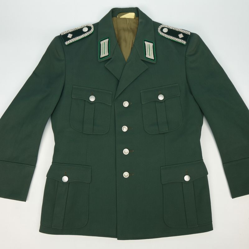 Vroeg model zonder groene biezen in de jas en met groene bies om de kraagspiegels