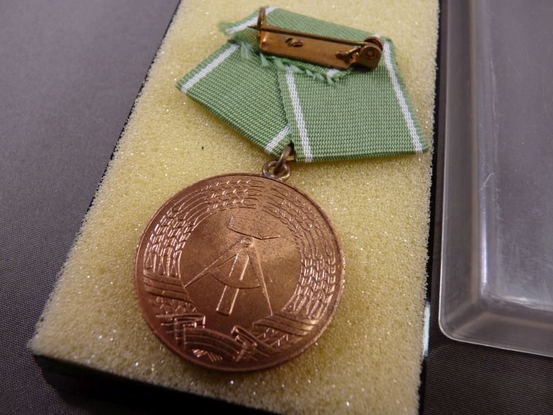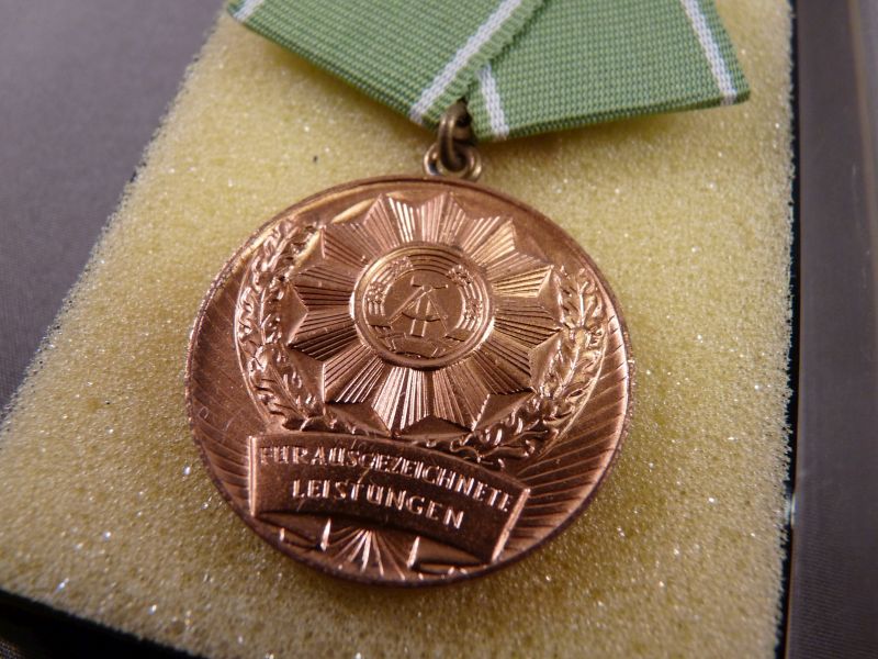 Authentieke bronzen medaille met groen lint, voorzien van de inscriptie “Für ausgezeichnete Leistungen”. Deze onderscheiding is uitgevoerd in massief brons en heeft een gedetailleerd reliëf met centraal embleem en decoratieve krans. De medaille is bevestigd aan een karakteristiek lichtgroen lint met subtiele witte strepen.
