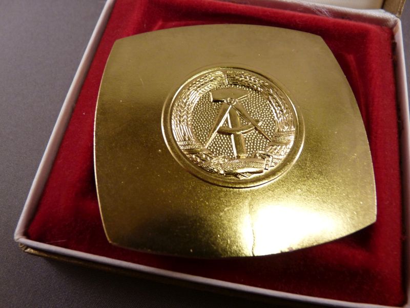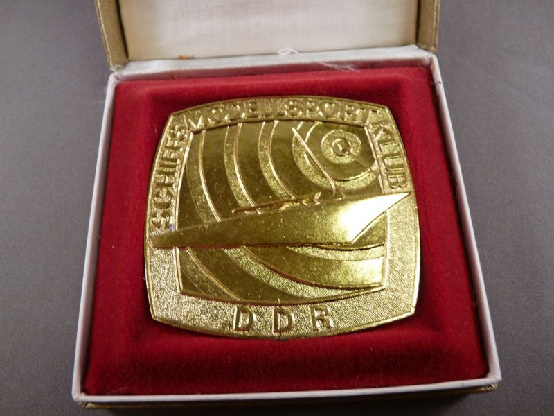 Prachtige originele gouden onderscheiding van de DDR (Deutsche Demokratische Republik) met het opschrift “Modelsport Klub”. Deze bijzondere medaille is uitgevoerd in een zware, goudkleurige metalen uitvoering en wordt geleverd in de originele presentatiecassette met rood fluwelen binnenvoering.