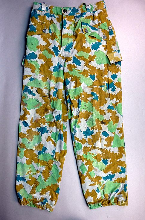 Broek is uit het modeljaar 1964, deze heeft in de rechterbroekzak al mogelijkheden voor het opbergen van de dosis meter met toebehoren en extra verstevigings vlakken onderaan de binnenzijden van de broekspijpen en geen koordje meer in de onderzijde