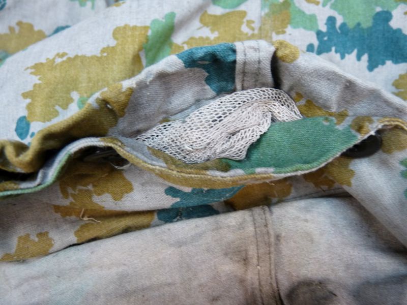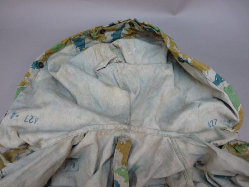 Authentieke militaire jas uit de voormalige DDR, gedragen door de Nationale Volksarmee (NVA). Dit betreft een vroeg model in het kenmerkende Blumentarn / Flächentarn camouflagepatroon, herkenbaar aan de speelse, bijna “bloemachtige” vormen in groen-, oker- en blauwtinten.