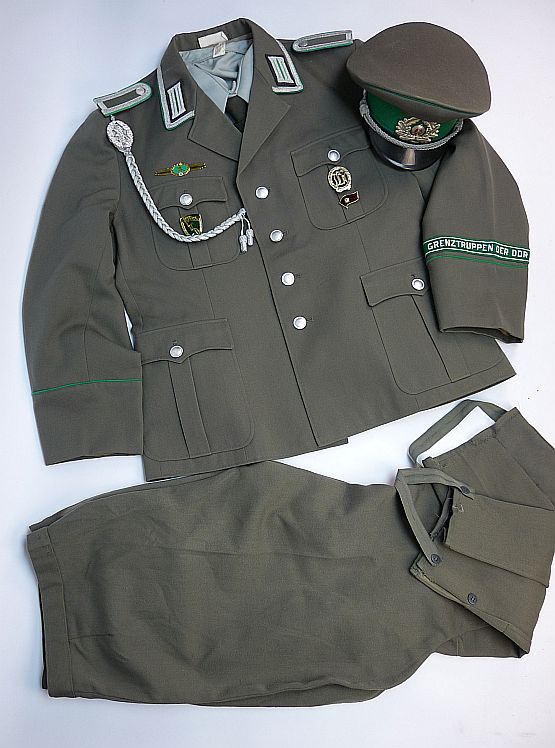 Authentiek uniform van de Grenztruppen der DDR, onderdeel van de Nationale Volksarmee (NVA). Dit originele Oost-Duitse uniform dateert uit de Koude Oorlog en werd gedragen door grenssoldaten die verantwoordelijk waren voor de bewaking van de DDR-grenzen.