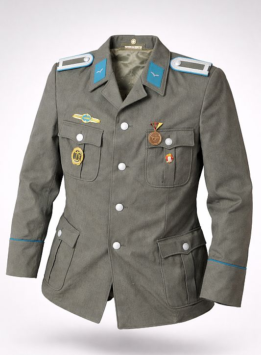 Authentiek militair uniformjasje uit de voormalige DDR, afkomstig van de Nationale Volksarmee (NVA) – specifiek de luchtmacht (Luftstreitkräfte). Dit jasje is een prachtig voorbeeld van Koude Oorlog-militaria en valt op door de karakteristieke blauwe accenten die horen bij de luchtmacht.