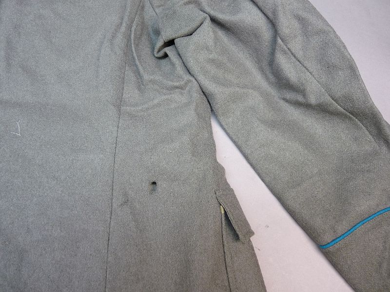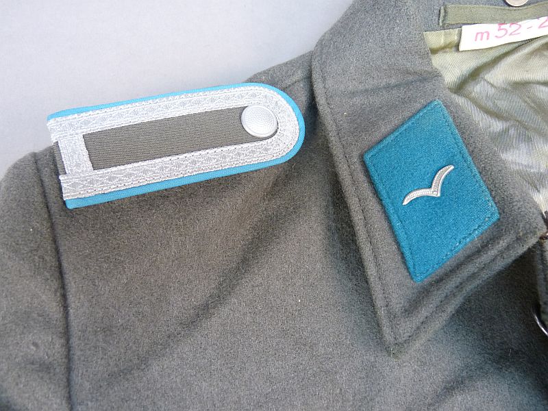 Authentiek militair uniformjasje uit de voormalige DDR, afkomstig van de Nationale Volksarmee (NVA) – specifiek de luchtmacht (Luftstreitkräfte). Dit jasje is een prachtig voorbeeld van Koude Oorlog-militaria en valt op door de karakteristieke blauwe accenten die horen bij de luchtmacht.