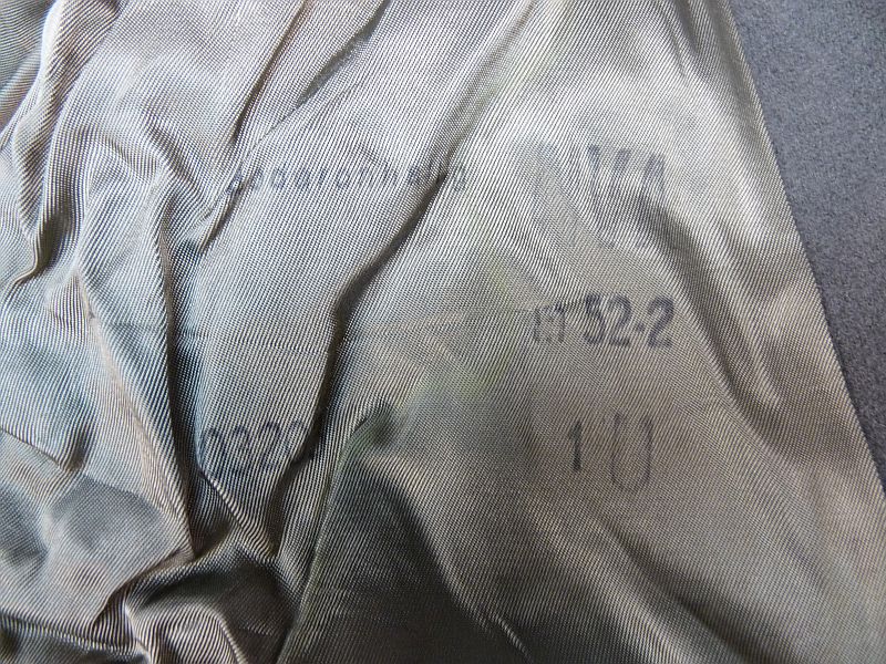 Het jasje is voorzien van originele insignes, waaronder borstbadges, medaille en rangonderscheidingstekens (Onderofficier / Sergeant) op de schouders. De binnenzijde draagt nog de originele stempels/markeringen, wat bijdraagt aan de authenticiteit.