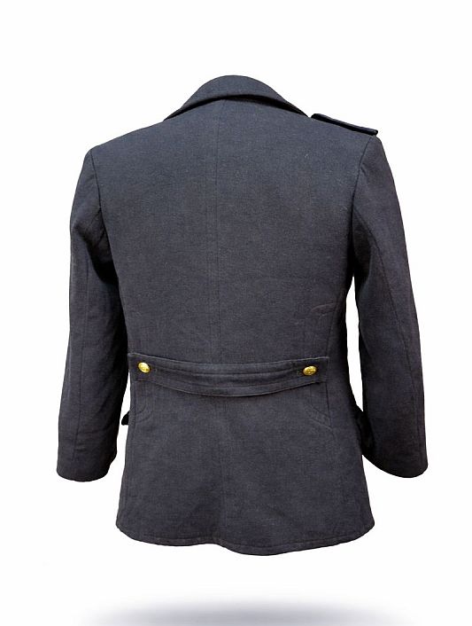 De jas is uitgevoerd in een klassiek dubbelrijig model waarvan 1 knoop afwijkend is, (vermoedelijk een keer vervangen) met brede revers en is voorzien van originele gouden marineknopen met ankerembleem. Op de schouders bevinden zich officiersschouderpassanten met zilverkleurige vlecht en één gouden ster, behorend bij de rang Leutnant zur See. De achterkant is afgewerkt met een karakteristieke halve ceintuur met knopen, typisch voor marinejassen uit deze periode.
