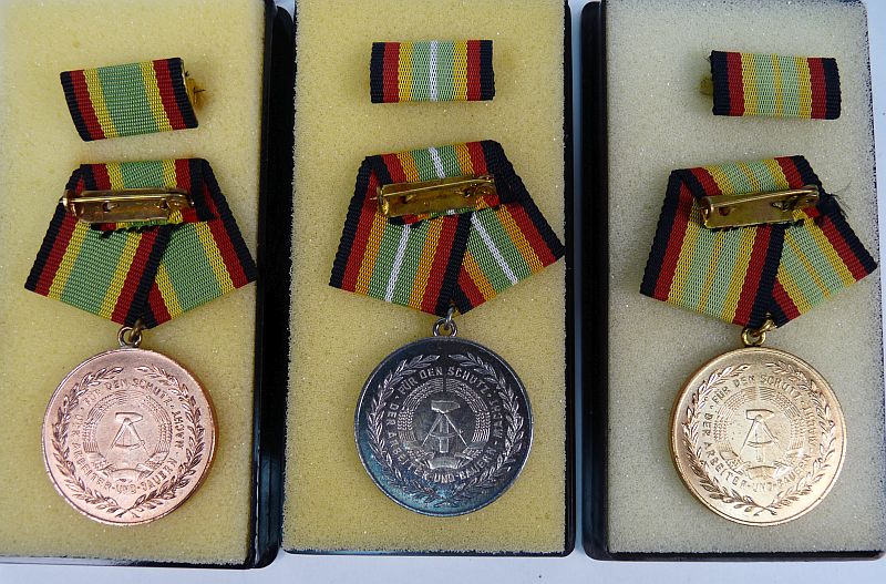 DDR NVA Treue dienst medaille, 3x, brons, zilver en goud aantal