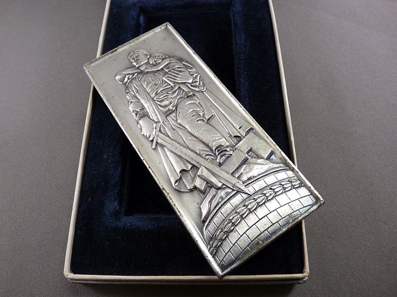 Bijzondere zilverkleurige metalen plaquette met reliëf van het beroemde Sovjet Oorlogsmonument in Treptower Park te Berlijn (DDR-periode).