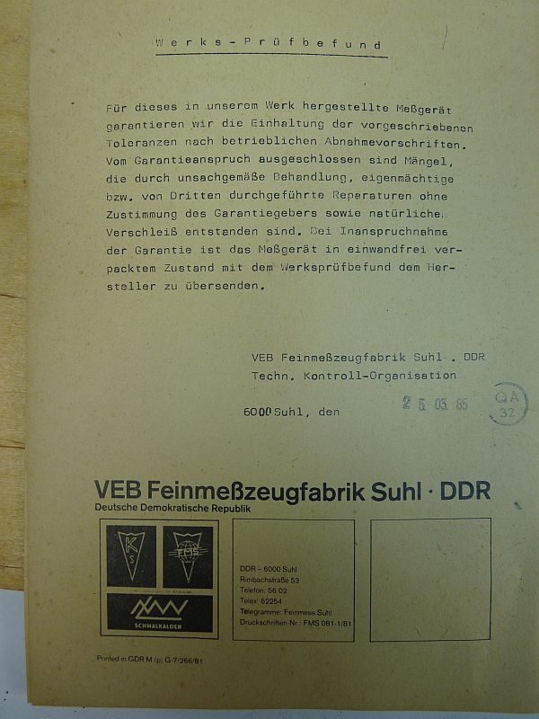 Fabrikant: VEB Feinmeßzeugfabrik Suhl – DDR