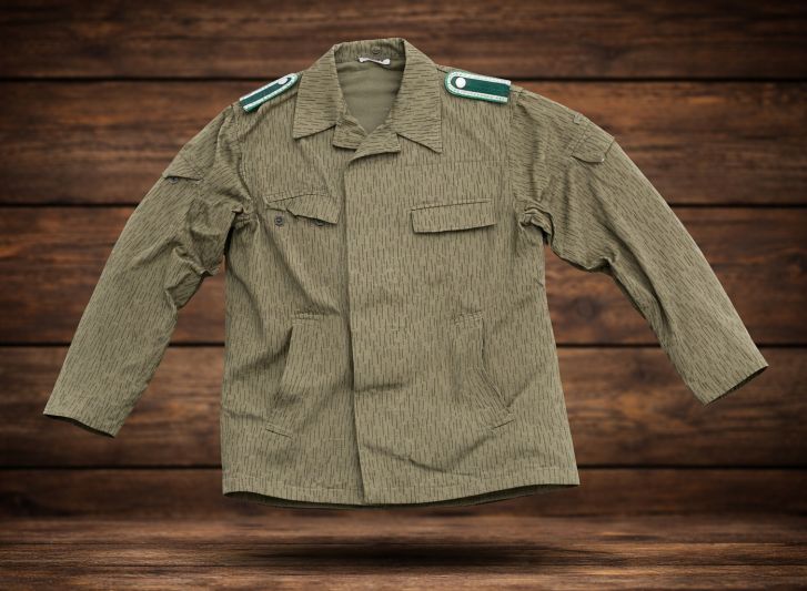 Het jasje is uitgevoerd in de typische olijfgroene “Strichtarn” (regenstreep) camouflage, herkenbaar aan de verticale, onregelmatige strepen. Deze stof werd veel gebruikt binnen de DDR voor zowel militaire als paramilitaire eenheden.