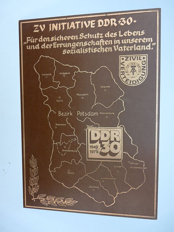 Authentiek historisch wandbord uit de voormalige DDR, uitgegeven ter gelegenheid van 30 jaar DDR. Het bord draagt de tekst “ZV Initiative DDR 30 – Für den sicheren Schutz des Lebens und der Errungenschaften in unserem sozialistischen Vaterland” en toont een kaart van Bezirk Potsdam met diverse plaatsen. Inclusief het embleem van de Zivilverteidigung.