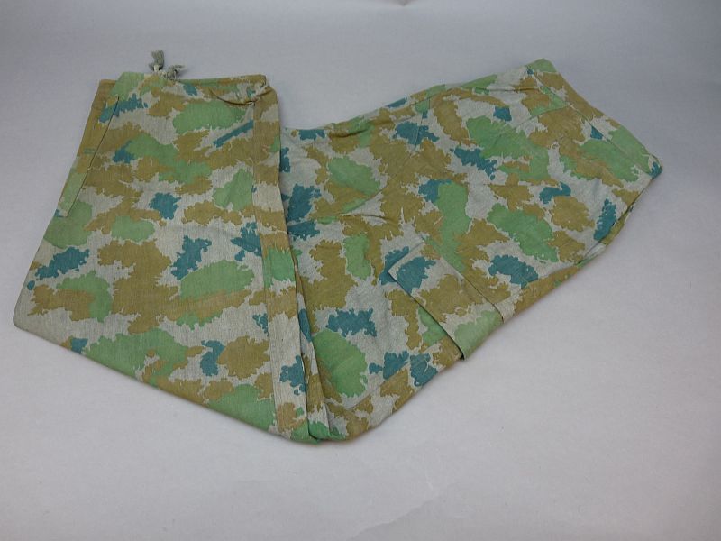 Originele eerste model Blumentarn / Flächentarn broek uit circa 1963, een vroeg en zeldzaam camouflagepatroon dat bekend staat om zijn kenmerkende organische vormen in groen-, beige- en blauwtinten. Dit type camouflage werd gebruikt in de vroege Koude Oorlog-periode en is tegenwoordig geliefd onder verzamelaars van militaire uitrusting.