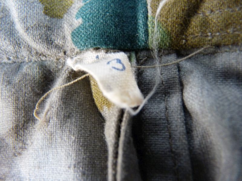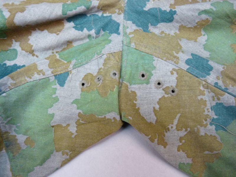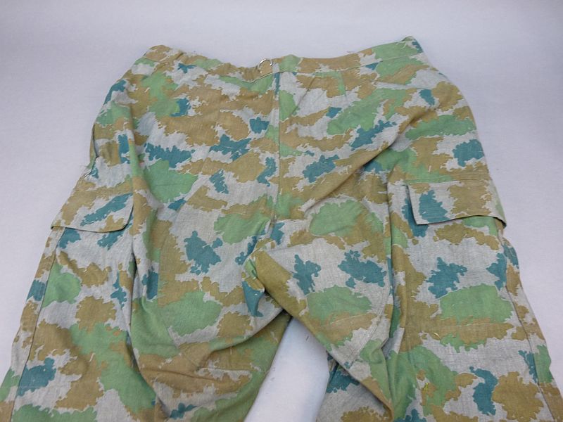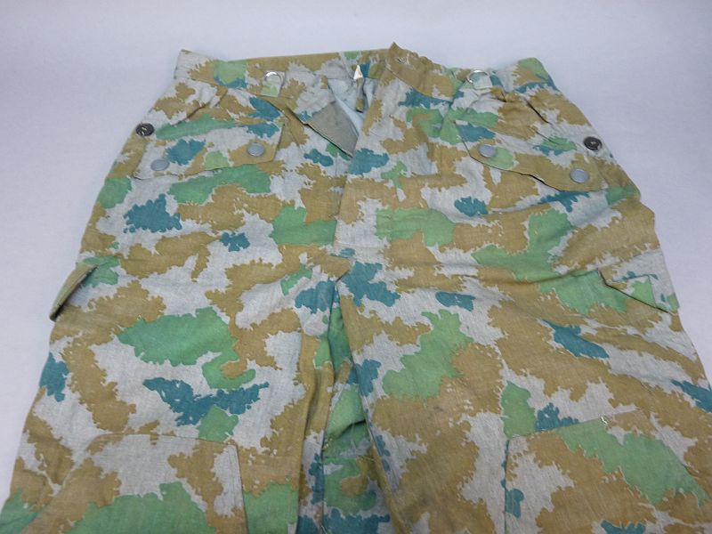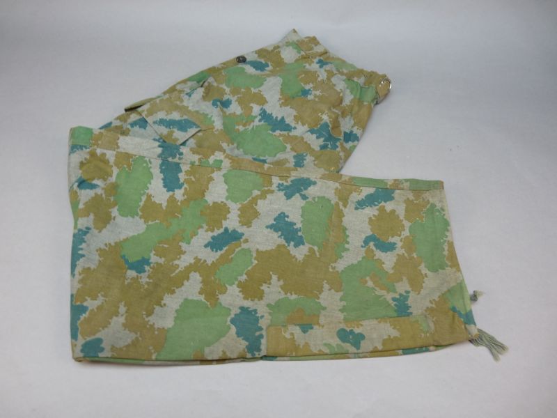 Originele eerste model Blumentarn / Flächentarn broek uit circa 1963, een vroeg en zeldzaam camouflagepatroon dat bekend staat om zijn kenmerkende organische vormen in groen-, beige- en blauwtinten. Dit type camouflage werd gebruikt in de vroege Koude Oorlog-periode en is tegenwoordig geliefd onder verzamelaars van militaire uitrusting.