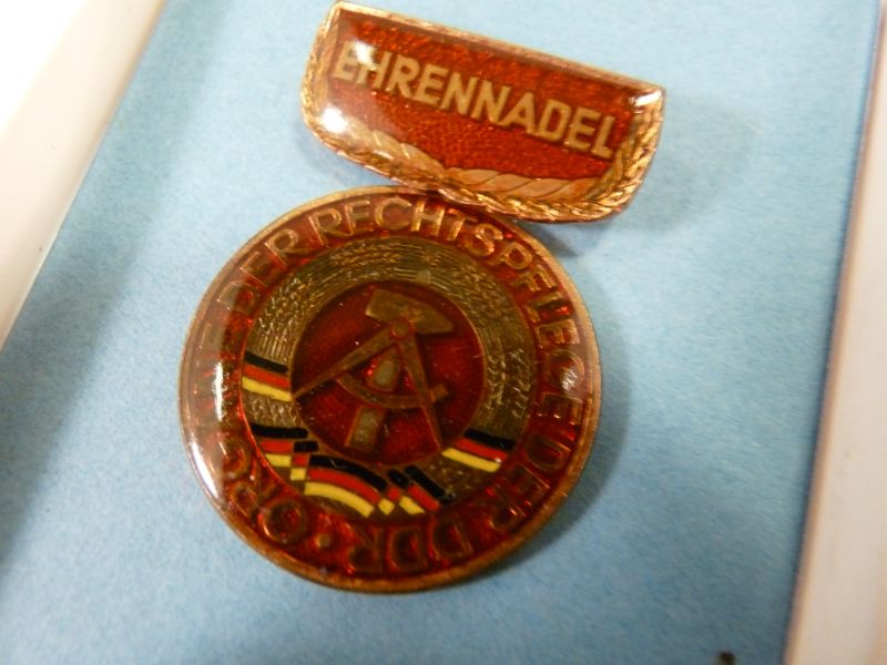 De afbeeldingen tonen een “Ehrennadel” (ereteken) van de voormalige Duitse Democratische Republiek (DDR), specifiek uitgereikt aan leden van het rechtssysteem: “DER RECHTSPFLEGE DER DDR”, oftewel “voor de rechtspleging van de DDR”.