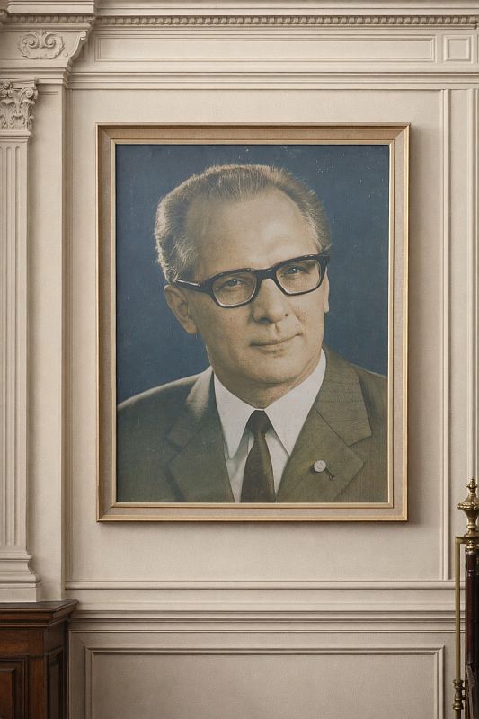 Dit soort portret is typisch voor officiële staatsportretten uit de jaren 70 die in overheidsgebouwen, scholen en fabrieken in de DDR hingen. Kenmerkende elementen: