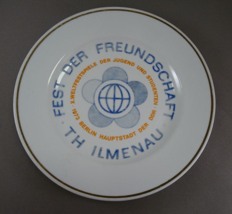 Een zeldzaam porseleinen herdenkingsbordje uit de voormalige DDR, gemaakt ter gelegenheid van het Fest der Freundschaft (Vriendschapsfeest) in Ilmenau. Het bordje herdenkt de X. Weltfestspiele der Jugend und Studenten (10e Wereldfestival van Jongeren en Studenten), gehouden in 1973 in Oost-Berlijn, destijds hoofdstad van de DDR.