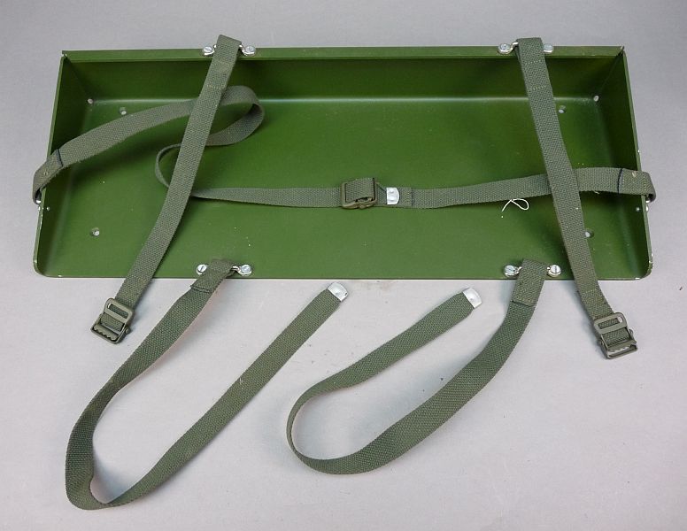 Dit betreft een robuuste, militaire houder voor een metalen, kunststof of houten kist, uitgevoerd in een olijfgroene kleur. De houder bestaat uit een stevige aluminium plaat met opstaande randen, speciaal ontworpen om een kist stabiel op zijn plaats te houden tijdens transport of montage.