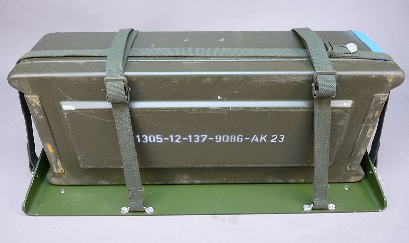 Dit betreft een robuuste, militaire houder voor een metalen, kunststof of houten kist, uitgevoerd in een olijfgroene kleur. De houder bestaat uit een stevige aluminium plaat met opstaande randen, speciaal ontworpen om een kist stabiel op zijn plaats te houden tijdens transport of montage.