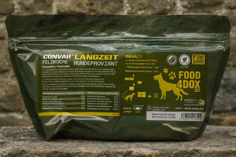 Met het FOOD-4DOX pakket biedt CONVAR™ veldkeuken een hoogwaardige, lang houdbare voedingsoplossing voor honden – bestaande uit twee repen van 120 g lang houdbaar hondenvoer en twee zakjes EF drinkwater van 250 ml. De repen kunnen droog worden gegeven of gemengd met het meegeleverde water om er natvoer van te maken.