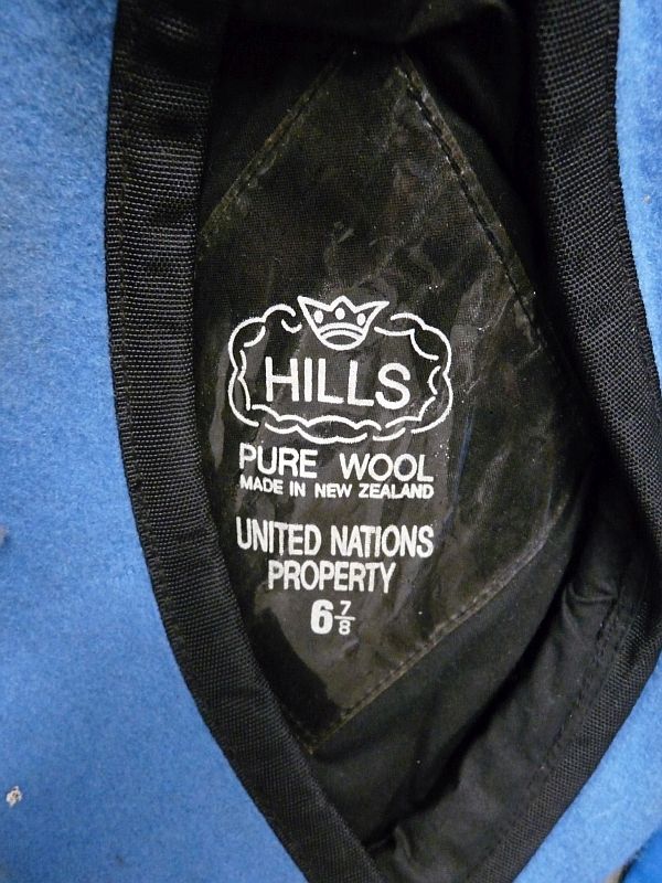 De baret is gemerkt HILLS – Pure Wool – Made in New Zealand – United Nations Property (maat 6 7/8).
