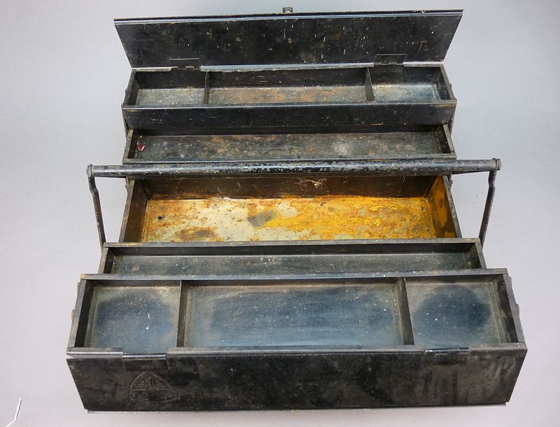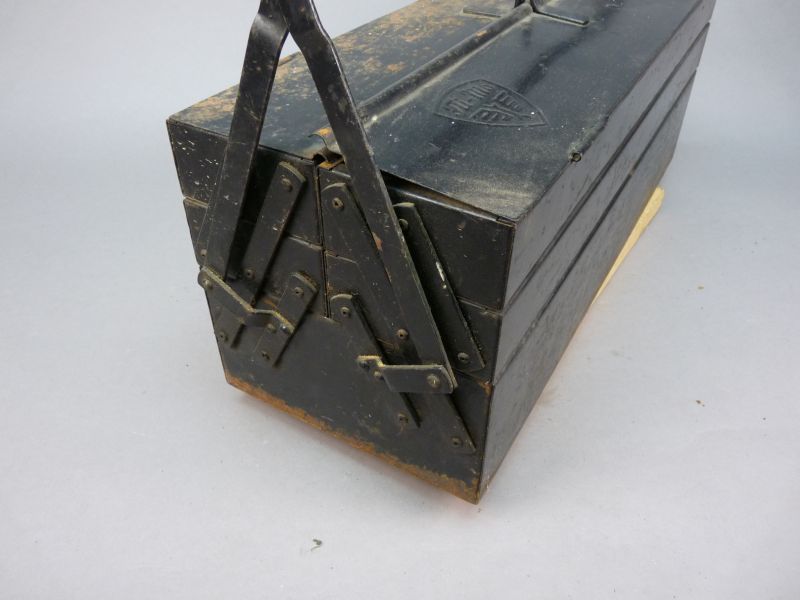 Aan de voorzijde is nog een ‘ingestanst embleem’ zichtbaar, typerend voor de Luftwaffe-werkplaatstools. De draagbeugel en sluiting zijn eenvoudig maar functioneel ontworpen om intensief gebruik op vliegvelden en in mobiele onderhoudseenheden te doorstaan.