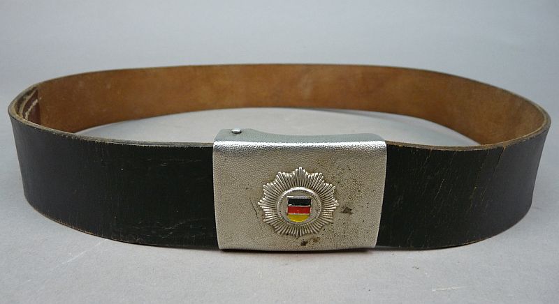 Militaire riem (koppel) van de Kasernierte Volkspolizei (KVP) uit de DDR, de paramilitaire politieorganisatie die bestond van 1952 tot 1956 en later werd omgevormd tot de Nationale Volksarmee (NVA). De riem bestaat uit een brede zwarte leren band met een zilverkleurige metalen gesp.