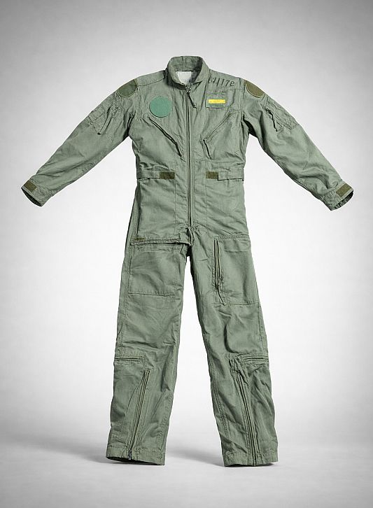 Originele Nederlandse pilotenoverall van de Koninklijke Luchtmacht (KLU), uitgevoerd in de kenmerkende grijsgroene kleur. Deze exemplaren zijn gebruikt als passet (pasoverall), wat betekent dat het diende voor pas- en maatdoeleinden binnen de luchtmacht.