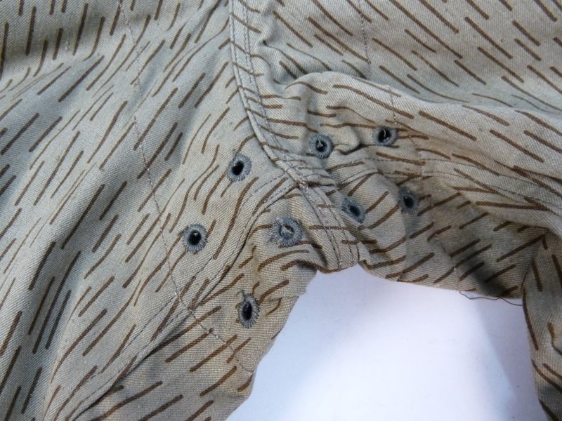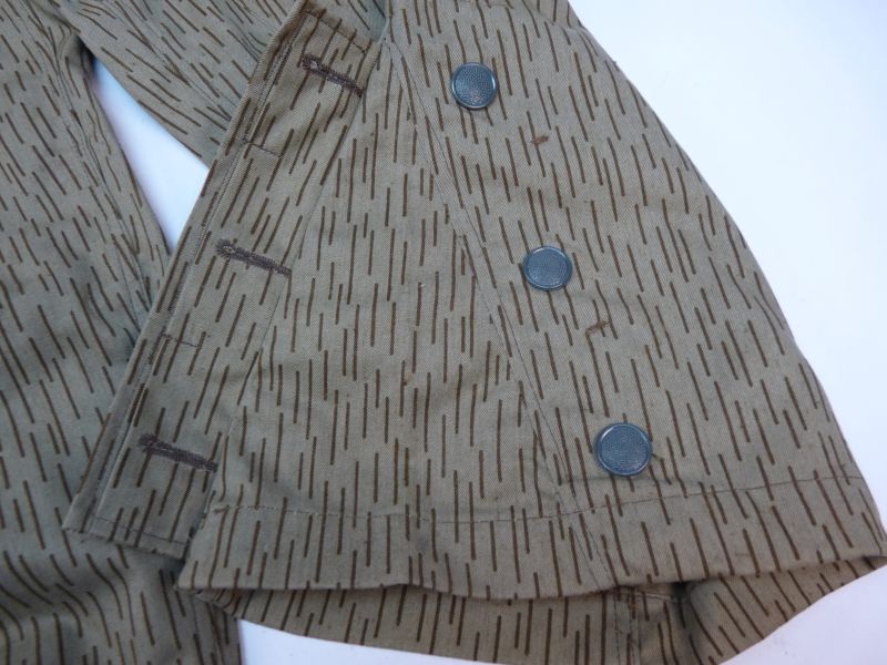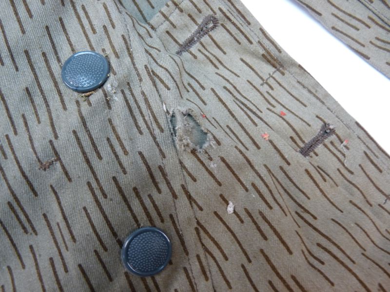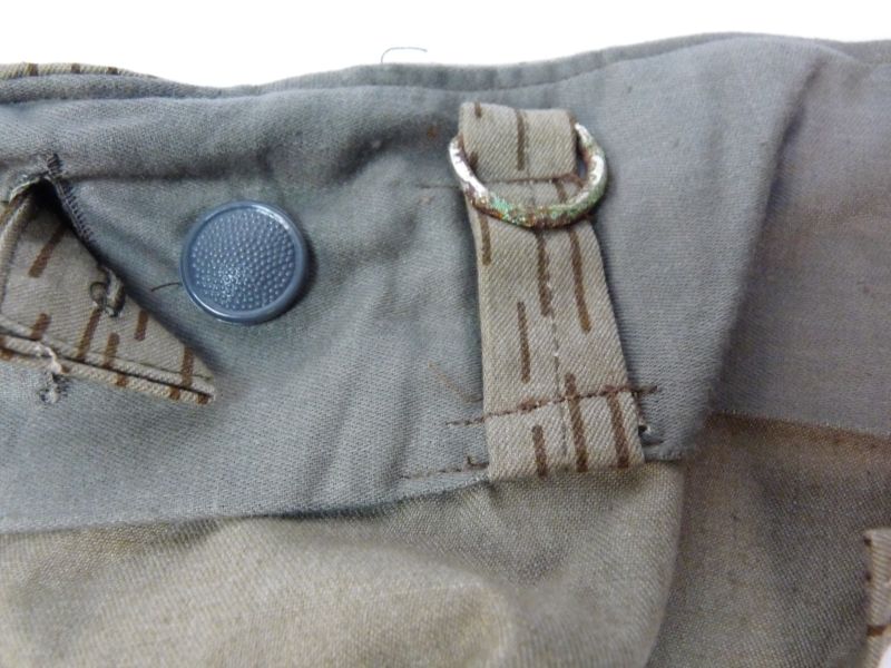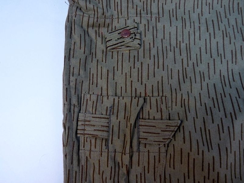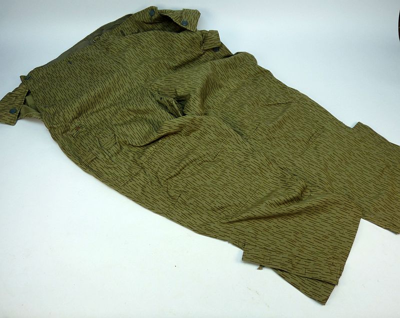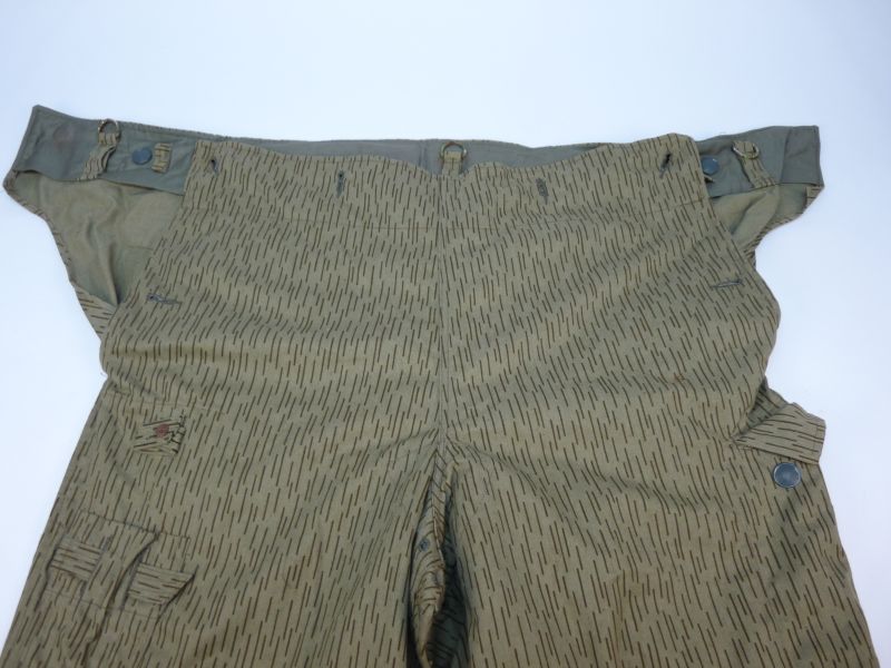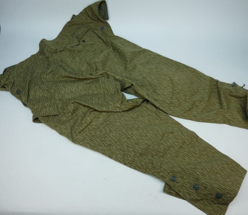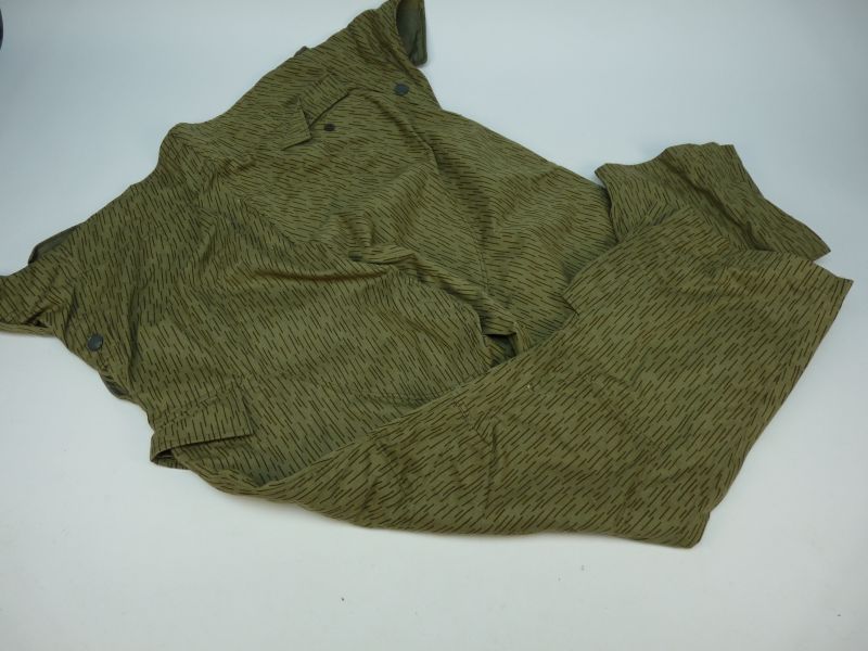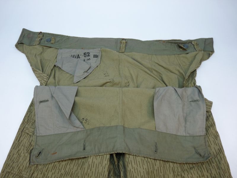 Extreem zeldzame originele Nationale Volksarmee (NVA) Fallschirmjäger / Aufklärer broek uit 1966, uitgevoerd in het karakteristieke Strichtarn (Regenstreifen) camouflagepatroon. Deze broek werd gebruikt door elite-eenheden van de Oost-Duitse strijdkrachten, waaronder parachutisten en verkenningseenheden.