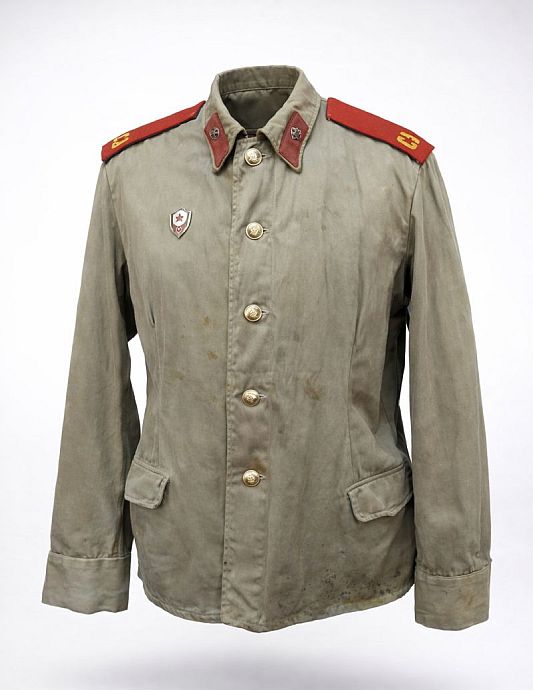 Authentiek Sovjet militair jasje uit de vroege Koude Oorlog, uitgevoerd in klassiek kaki en voorzien van rode schouderstukken en rode kraagspiegels, kenmerkend voor het Rode Leger.