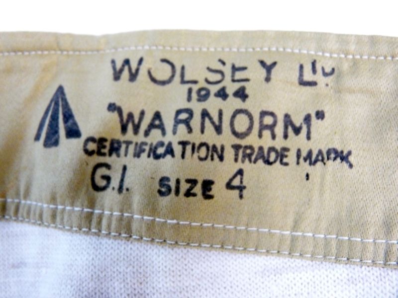 De onderbroek is uitgevoerd in een warme, geribde stof die bedoeld was als thermisch ondergoed voor militair gebruik. De binnenzijde van de tailleband is duidelijk gestempeld met “Wolsey 1944 Warnorm Certification Trade Mark G.I. Size 4”, wat de authenticiteit bevestigt.