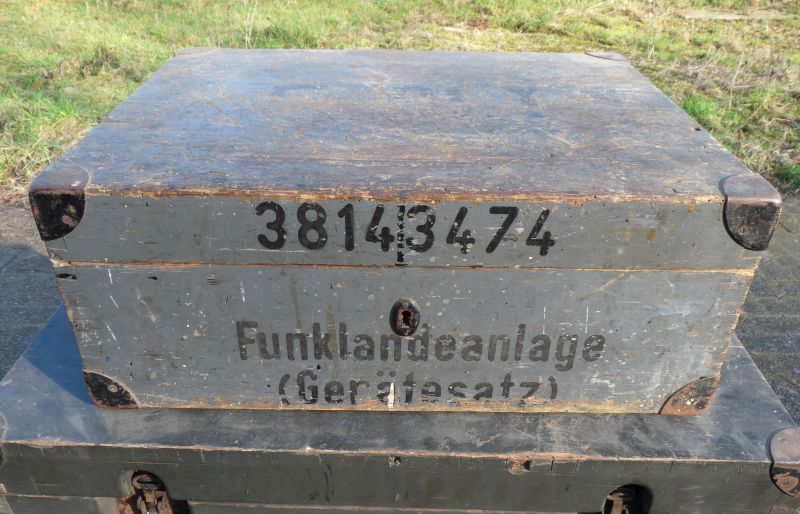 Originele vintage houten transport- en opbergkist van de Duitse Luftwaffe, gemarkeerd met “Funklandeanlage (Gerätesatz)” en serienummer 38143474. Deze kist werd gebruikt voor het opbergen en transporteren van radio- of landingsapparatuur binnen de Duitse luchtmacht tijdens de Tweede Wereldoorlog.
