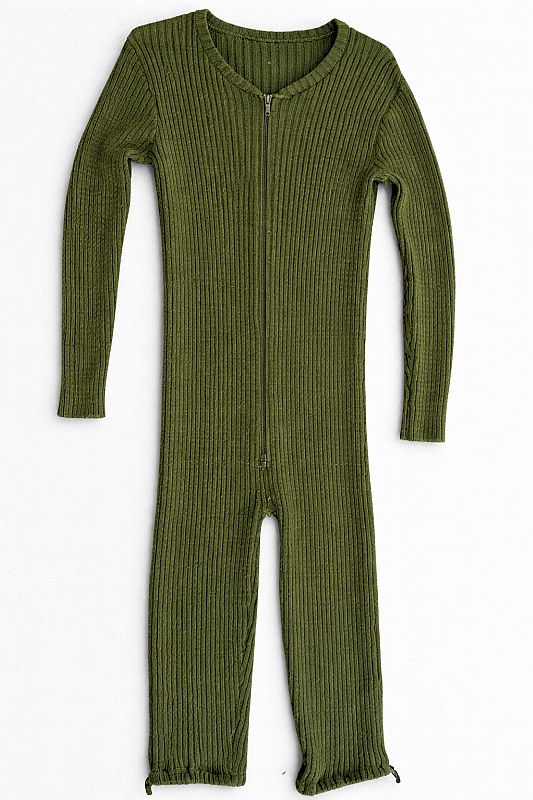 Dit is een nauwsluitend, olijfgroen thermopak met een ribgebreide structuur. Het kledingstuk heeft in lengte aanpasbare lange mouwen en vrij korte pijpen, waardoor nagenoeg het het hele lichaam bedekt en geschikt is als onderlaag bij koude omstandigheden oorspronkelijk bedoeld voor piloten