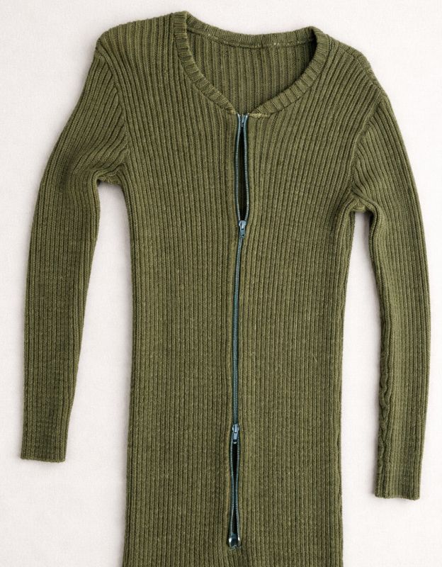 Dit is een nauwsluitend, olijfgroen thermopak met een ribgebreide structuur. Het kledingstuk heeft in lengte aanpasbare lange mouwen en vrij korte pijpen, waardoor nagenoeg het het hele lichaam bedekt en geschikt is als onderlaag bij koude omstandigheden oorspronkelijk bedoeld voor piloten
