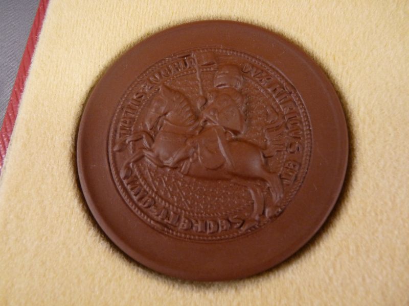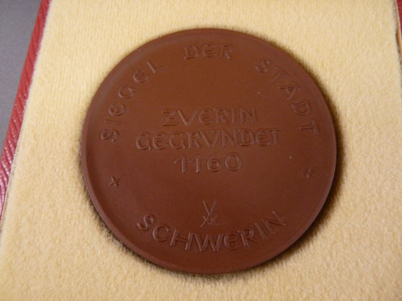 Zeer fraaie en zeldzame porseleinen medaille (zegelafdruk) van de beroemde porseleinfabriek Meissen, gepresenteerd in originele luxe roodleren doos met fluwelen binnenzijde. De medaille is een reproductie van het historische stadszegel van Schwerin, met op de voorzijde een ridder te paard met lans en op de achterzijde het opschrift: