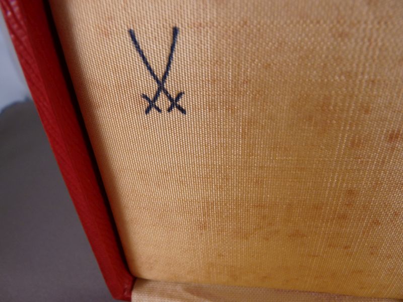 Onder het opschrift en in de binnenzijde van de doos staat het klassieke Meissener zwaardmerk – een garantie van authentiek Meissen-porselein.