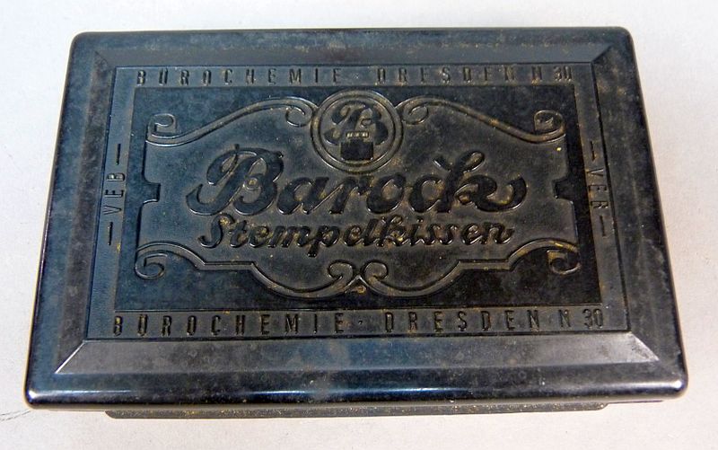 • Een originele stempelkussen doos met opschrift “Barock Stempelkissen – Bürochemie Dresden”