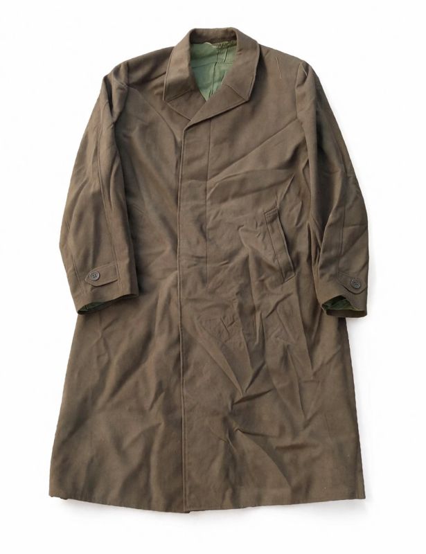 Deze authentieke lange herenjas is een originele Sovjet jas en straalt een robuuste, militaire en tijdloze stijl uit. De jas is uitgevoerd in een olijfbruine kleur met een matte afwerking, wat zorgt voor een klassieke en stoere uitstraling.