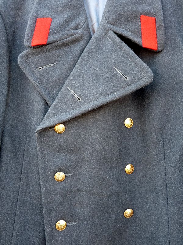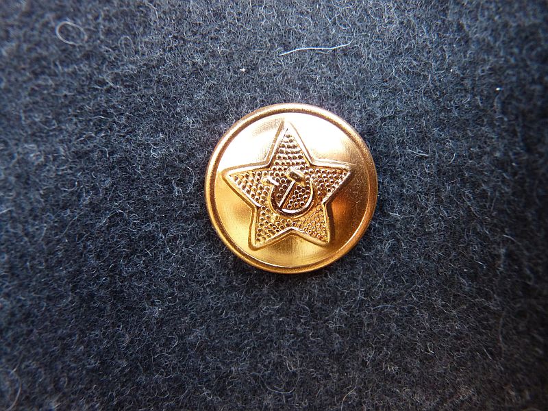 • Model: Dubbelrijige sluiting met zes goudkleurige metalen knopen aan de voorzijde. De knopen zijn voorzien van een ster met hamer en sikkel – het embleem van de Sovjet-Unie.