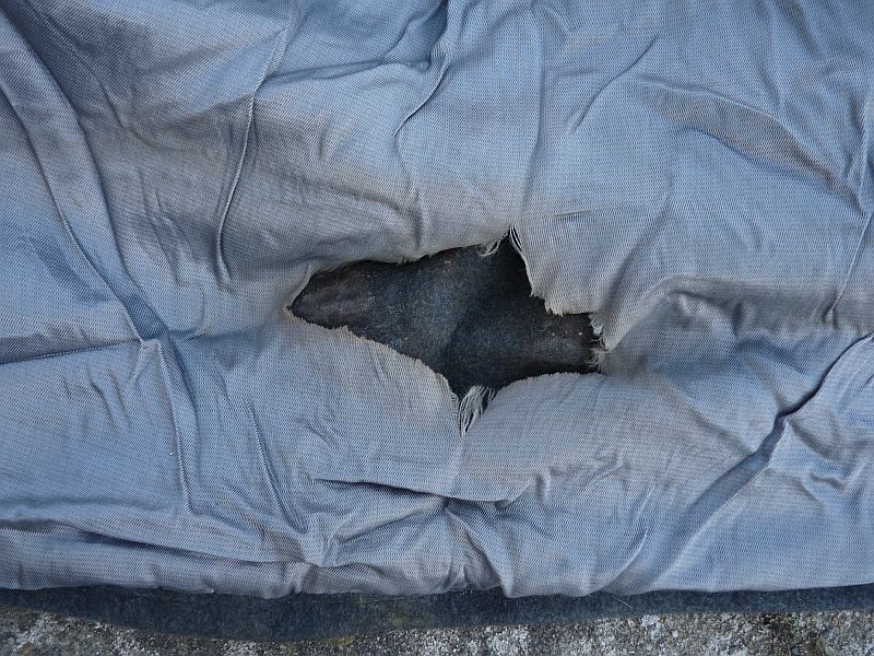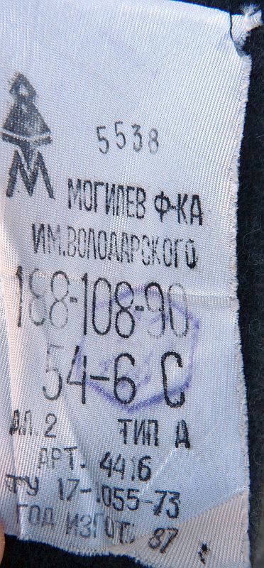 • Binnenzijde: De voering vertoont gebruikssporen en slijtage, waaronder een scheur onderin. Het label bevat Cyrillische tekst en productiestempels, met jaartal 1987, wat duidt op productie in de late Sovjetperiode.