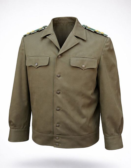 De snit is typisch Sovjet: strak, functioneel en autoritair, met borstzakken en stevige uniformstof. Een indrukwekkend stuk militair erfgoed dat direct de sfeer van de Koude Oorlog oproept.