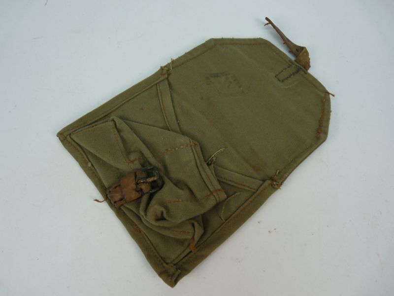 In gebruikte, originele staat met normale slijtage passend bij leeftijd en militair gebruik. Het canvas vertoont verkleuring en gebruikssporen; de lederen sluiting is nog aanwezig.