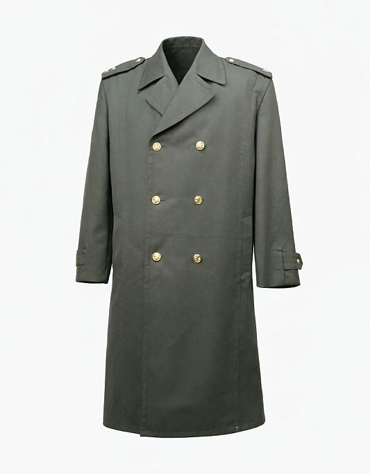 Authentieke Tsjechische officiersmantel uit het voormalige Oostblok, uitgevoerd in klassiek olijfgroen. Deze zware, dubbelgeknoopte mantel werd gedragen door officieren en staat bekend om zijn strakke snit, degelijke wolkwaliteit en tijdloze uitstraling.